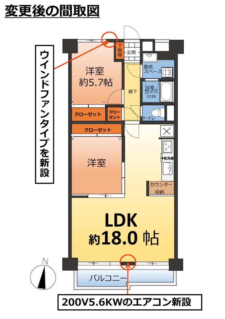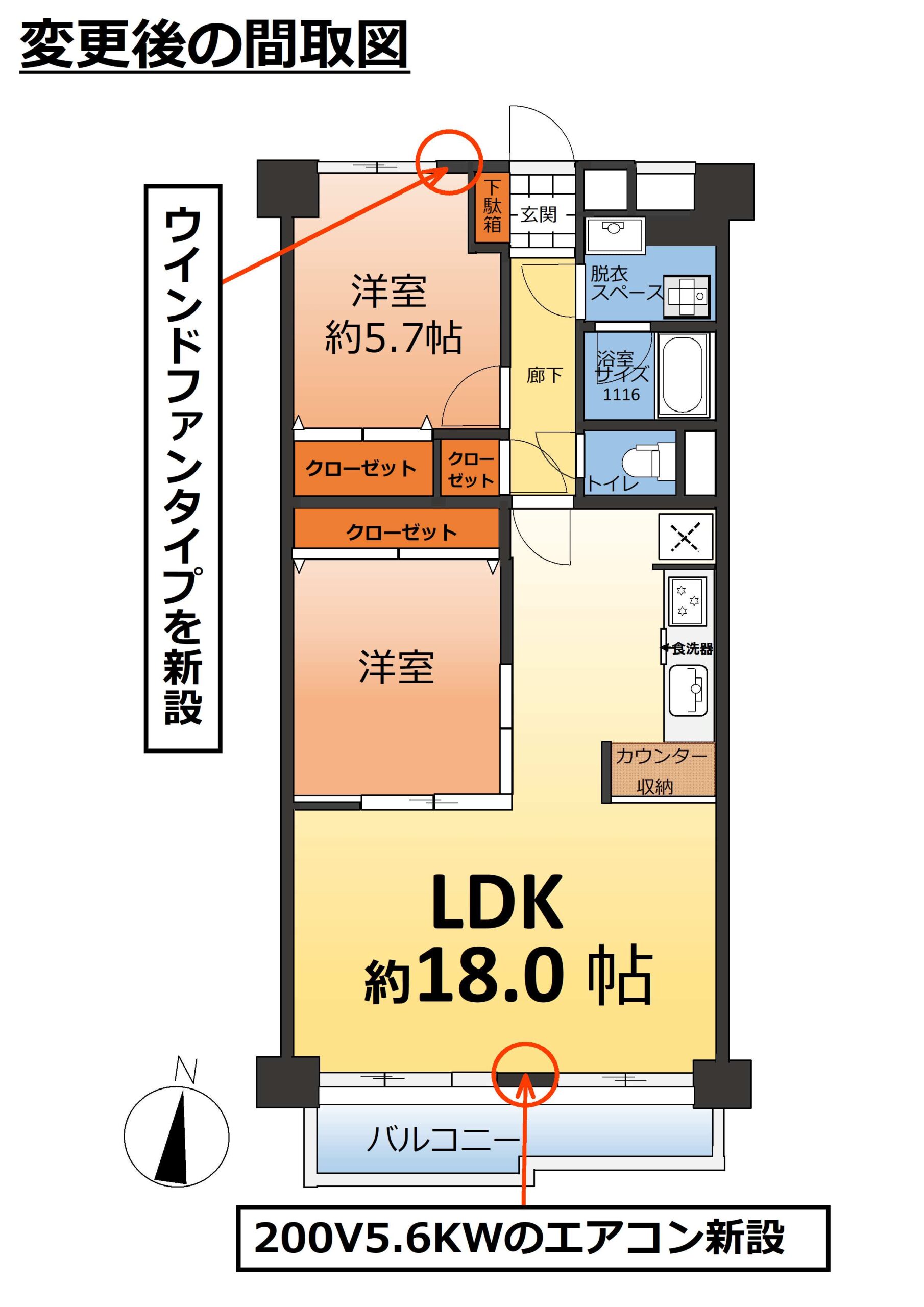 (リビング:200V・冷房5.6KWタイプ、北側洋室5.7帖:ウインドファンタイプ)