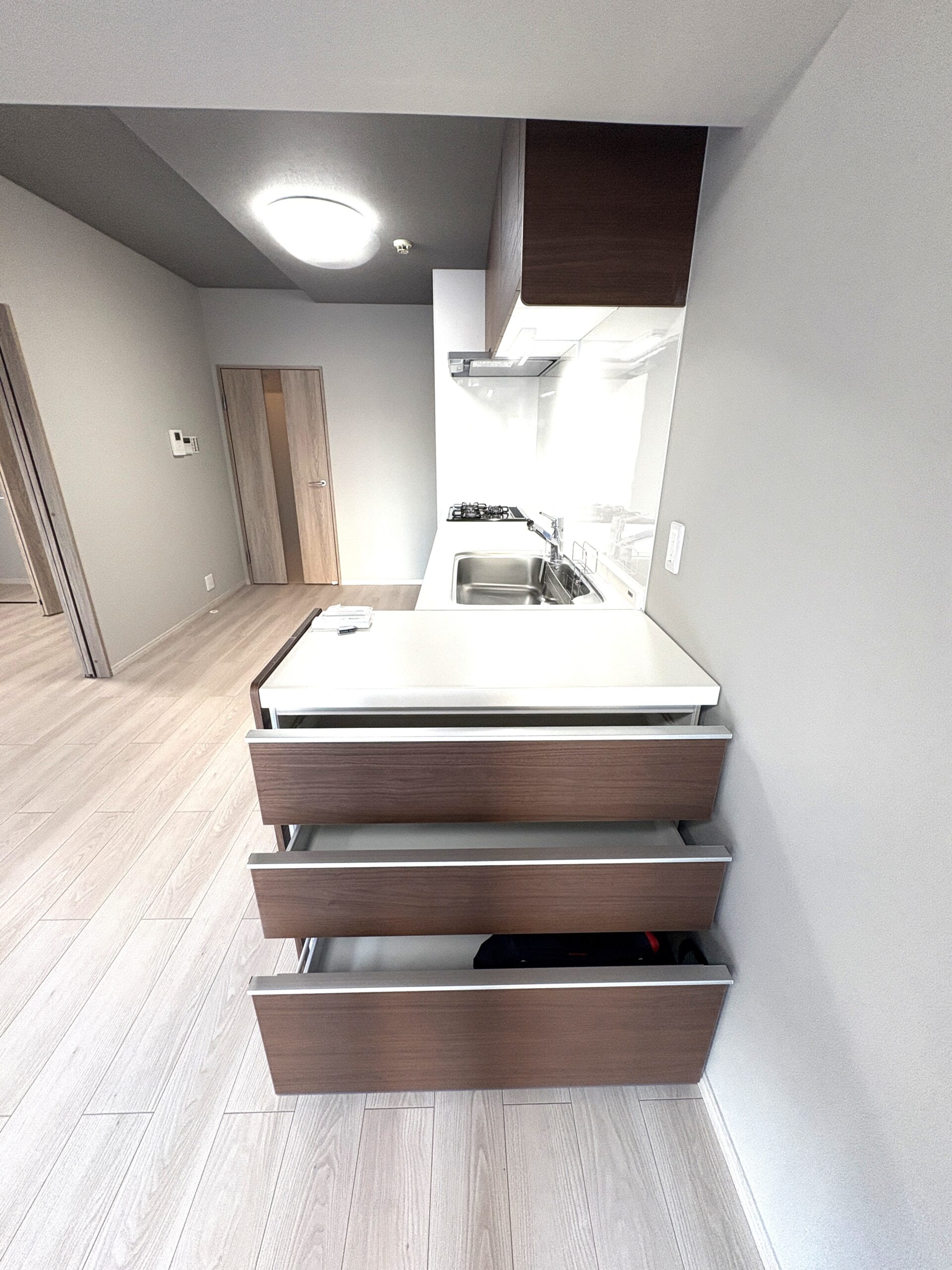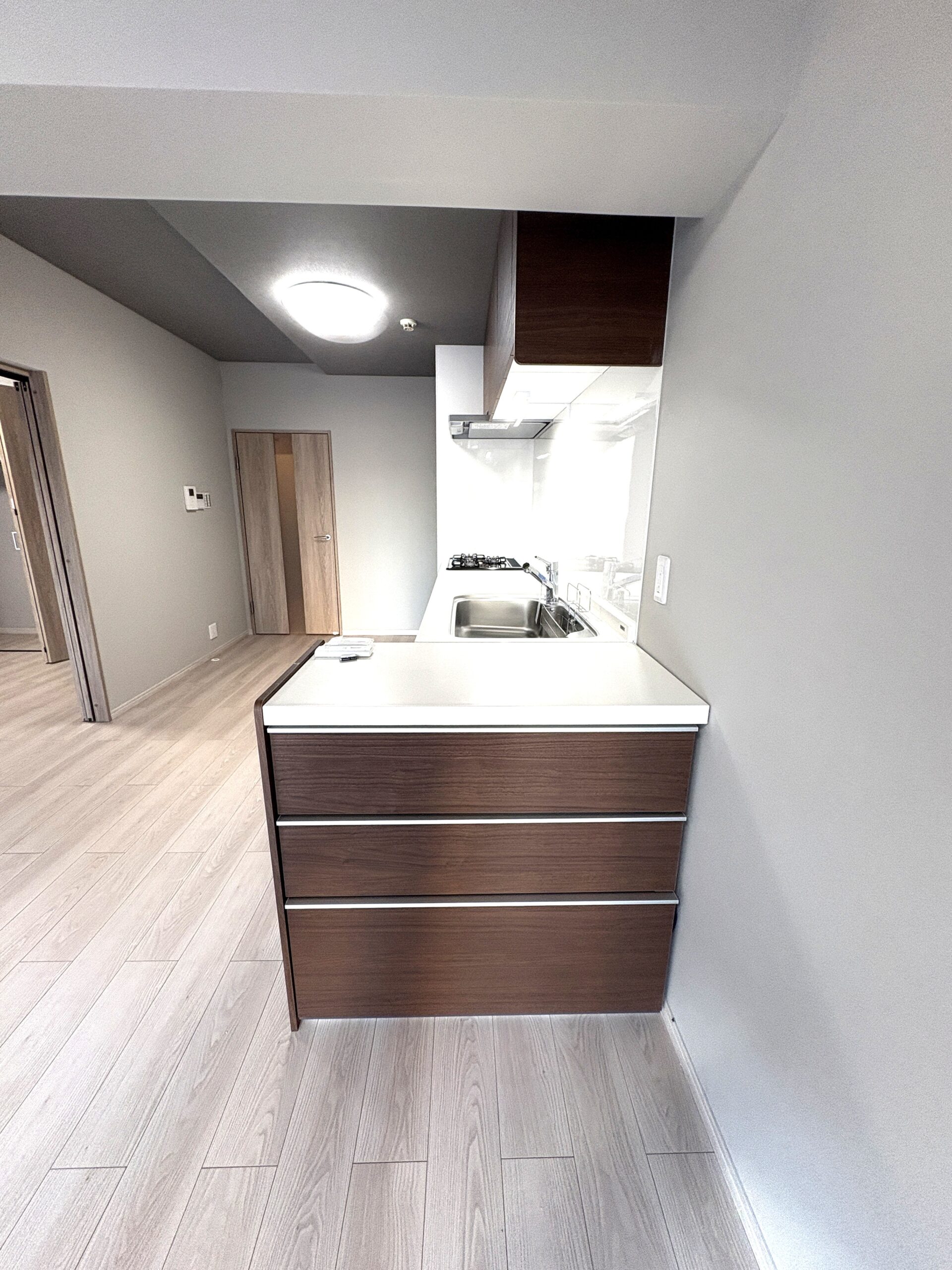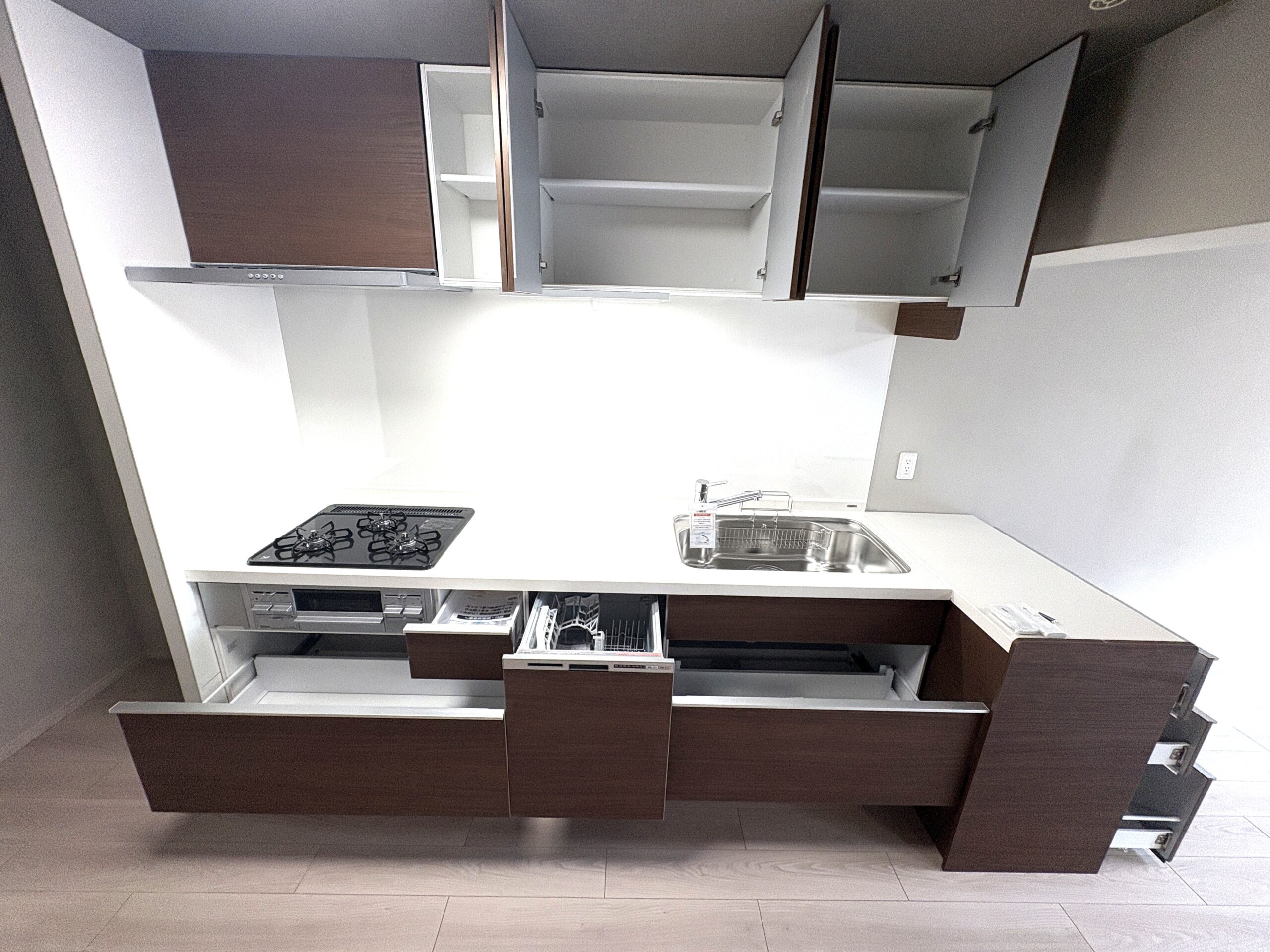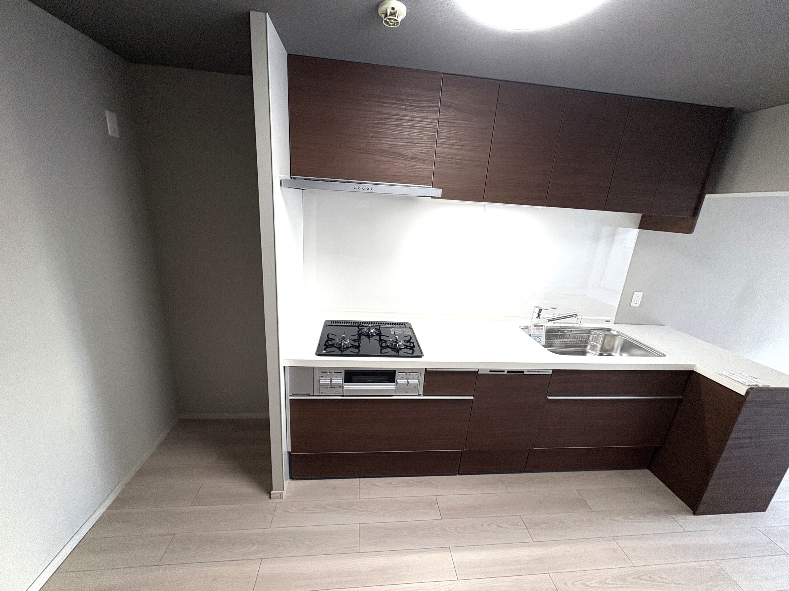 ・システムキッチン(食洗器付)パネル張。簡易カウンター(収納有)設置