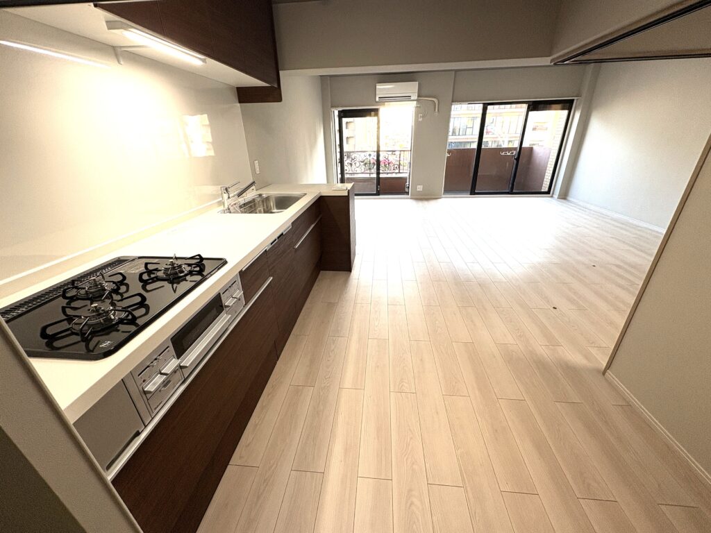 ●LDK・南バルコニー側からキッチンに向けて(左は南側洋室は引き違い扉解放時・右は扉使用時)